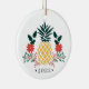 Festive holiday ornament features the Hawaiian Christmas greeting "Mele Kalikimaka" in red hand lettered typography, surrounded by red poinsettias, holly leaves and Christmas greenery. Customise the reverse side with the year for a sweet holiday keepsake, beneath a Christmas pineapple illustration flanked by matching poinsettia flowers and holly.