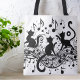 Celebrate the perfect symphony of feline charm and musical artistry with the Melodic Cats Tote Bag! This beautifully crafted tote features a whimsical design of three playful black cats playing on a swirling musical staff, surrounded by scattered musical notes and twinkling stars. The striking black-and-white contrast makes this bag a standout accessory for music lovers and cat enthusiasts alike. Whether you're heading to a concert, a café, or just out and about, this tote is sure to strike the right note!