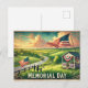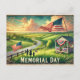Here’s a vintage watercolor-style travel postcard for Memorial Day, featuring a patriotic American countryside scene with rolling green fields, a wooden gazebo draped with flags, and a family waving small American flags. 🇺🇸✨ The design has soft, faded colours and nostalgic vintage typography, creating a warm and charming look.