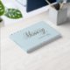 Customer specific, memorial, elegant, simpel "In Loving memory" rose-gold-foil handwriting font, ligt-blue funeral guest book. Availible in gold, copper and silver foil.