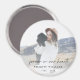 Modern, minimalist photo funeral favour fridge magnet to celebrate the life of your loved one in a minimalist clean simple design style featuring an informal casual handwritten script font. The design can easily be personalised with your own photo and text to create a special tribute for your loved one's funeral, memorial or celebration of life. The image shown is for illustration purposes only to be replaced with your own photo. The placeholder image shows a young woman with wavy blonde hair wearing a hat and white sweater dress sitting on a gold vintage jeep in the mountains cuddling an adorable black dog.