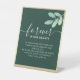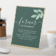 Elegant, simple greenery emerald green wedding memorial table pedestal sign with modern calligraphy script.