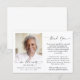 Send these photo memorial thank you cards from the family of your loved one for the kindness and compassion shown during your difficult time. The design features a cherished photo and the sentiment IN LOVING MEMORY in a modern, elegant script typography and your preprinted custom message on the front with a blank back side for handwriting additional personal notes. ASSISTANCE: For help with design modification, transferring the design to another product or if you would like coordinating items, contact the designer BEFORE ORDERING via the Zazzle Chat MESSAGE tab or email makeitaboutyoustore@gmail.com.