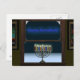 A depiction of a traditional Chanukkah menorah in a window. The menorah is reflected in the window, there's frost on the glass, and snow outside.