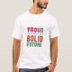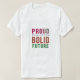 The design for the t-shirt with the tag "Proud Tradition Bolid Future" is a visually dynamic and captivating artwork that celebrates both heritage and innovation. The text itself is prominently featured, with each word rendered in a different, vibrant colour, creating a striking and eye-catching composition. The design's abstract elements, such as flowing ribbons and organic shapes, symbolise the harmonious blend of tradition and progress. The overall aesthetic is modern and energetic, conveying a sense of pride, confidence, and optimism.