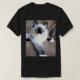 A sleek T-shirt design featuring a playful Siamese cat with piercing blue eyes, surrounded by minimalist geometric patterns and soft pastel colours, emphasising elegance, charm, and feline grace.