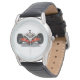Mens classic black leather strap watch shown with a photo print of a race formula car. Choose from several styles. Customise this watch or buy as is. Stock Image
