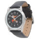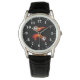 Men's classic leather strap watch shown in black with a sporty flaming soccer balls print.