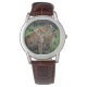 Men's classic brown leather strap watch shown with a wildlife cheetah's photo print.