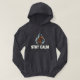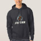 This image tells a visually poetic and symbolic story. At the centre is a large, glistening water droplet suspended in space, inside of which vibrant orange mushrooms grow alongside tiny fish swimming in a miniature aquatic ecosystem. Beneath this surreal droplet, bold white letters spell out the words "STAY CALM."