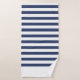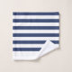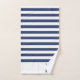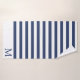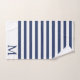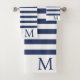 This custom bath towel set features a sophisticated nautical striped design. The pattern features navy blue and white stripes that run horizontally. A sample monogram initial is printed near the bottom of each towel and washcloth, which you can personalise to include your own custom initial or other text.