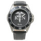 Men's Registered Nurse Caduceus Custom Black Leather Watch makes a great gift idea for a male nurse. The leather band is also available in different colours and styles. The watch facing is designed with a black customisable background and a white medical caduceus symbol on the centre. "RN" is on the centre sides of the symbol. Personalised with name in white calligraphy script lettering on the lower area.