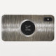 Silver brushed aluminium look monogram cellphone case for men created with digital backdrop artwork designed to mimic the look of a metallic finish along with a monogram emblem template that has a name initial you can replace with your name letter or company name initials in a style all your own.