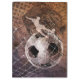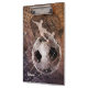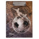 Grungy men's soccer clipboard featuring a composite blend of soccer graphics with silhouetted men's soccer player kicking a soccer ball into the goal and soccer ball denting the net at the back of the goal - customise with his name - by katz_d_zynes