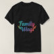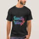 The t-shirt features the text "Family Wings" written in multiple colours, vibrant, with a blurred background.