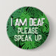 Let people know about your medical needs with this tropical badge by JessicaAmber. This button features the slogan 'I am deaf. Please speak up.' in a bold font, over a pattern of green palm leaves. You can edit the text as needed. A great accessory for your next summer vacation. 🌿 For more deafness pins, visit my store Zazzle.com/Elder_Vitality 🌿 For custom orders, message me on Zazzle