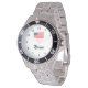 Men's watches with custom name and American flag. Steel watch with flag of America. Patriotic red white and blue design. Great gift idea for 4th of July / Independence Day. USA stars and stripes pride wear. Personalizable with name or other text. Customise for men and women.