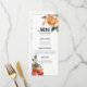 Introducing the slim menu card from the "Marble Dreams: Orange Rose Elegance Collection," a refined and sophisticated addition to your wedding reception. At the top of the card, against a backdrop of luxurious marble veined with delicate swirls, the caption "Menu" is gracefully displayed, accompanied by the couple's names and the wedding date, adding a personal touch to the design. Below the header, a carefully curated selection of meals is presented, each listed with meticulous attention to detail. From appetizers to entrees and desserts, guests are invited to indulge in a culinary journey that reflects the couple's tastes and preferences.