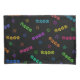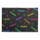 A pattern for cat lovers featuring the word "meow" written with a paw print font in a rainbow of colours on a black background. Cute, colourful kitty faces complete the design.