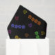 A pattern for cat lovers featuring the word "meow" written with a paw print font in a rainbow of colours on a black background. Cute, colourful kitty faces complete the design. The back is solid black but can be changed to any colour with the design tool.