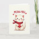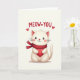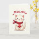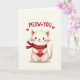 This greeting card features a plump white cat centered on a creamy off‑white background, giving the scene a calm, cozy feel. The cat’s wide dark eyes and slightly rosy cheeks create a tender, friendly look, with delicate whiskers and a blush‑pink nose adding softness 🥰. A deep crimson scarf wraps around its neck, with fringed ends that bring a little motion to the still pose. Held close to its chest is a plush, dark red heart that reads like a quiet cuddle ❤️. Above the cat, the text “MEOW ♥ YOU” sits near the top in rounded red lettering, with the heart symbol in the same red. A few small red hearts float around the words, lightly scattered in the open space. Gentle shading along the cat’s round body and under the scarf gives the illustration a smooth, plush appearance. The scarf’s fringes hang down in short tassels, and the tiny hearts near the top appear as simple red shapes against the pale backdrop.
