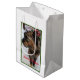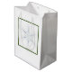 Place your gift in this bag that features the message, "Meowy Christmas" with a photo of a cat with a Christmas decoration on her head. You can change the photo to one of your own if desired. On the back side is a fractal snowflake. Green borders on each side contrast with a white background and with red writing.