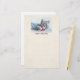 Stationery paper with a cute Christmas photograph of a grey tabby cat playfully biting a red santa hat.