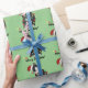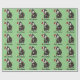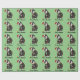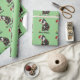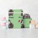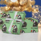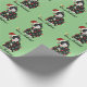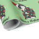 This cute design features a cartoon black and white tuxedo cat, wearing a Santa hat and tangled up in Christmas lights, on a light green background. The text reads "Meowy Christmas!" The perfect gift wrap for cat lovers.