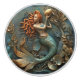 Beautiful orange haired mermaid holding a sea shell in a 3D style design with teal, gold, copper hues.