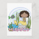 An adorable little mermaid design featuring an African American mermaid, fish, seaweed, and a big clam on Mermaid T-shirts, mugs, magnets, cards, stickers, tote bags, and other mermaid items.