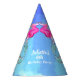 This adorable mermaid themed party hat will be a hit with the birthday girl and her friends. The illustration is fun with shades of pinks and blues and the text can be personalised.