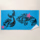 Beach towel with two silhouettes of mermaids each holding a pink starfish against a blue background with bubbles.