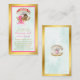 Sleeping baby mermaid in a gold clam shell surrounded by pearls. Pink tail fin and gold & pink tiara. Banner on shell reads "Precious". Mint background.