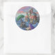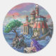 If you love mermaids, then this painting is for you. Mermaid Castle painted by Traci Van Wagoner features a mermaid with purple hair in front and a mermaid with green hair sunning herself on rock islands while another mermaid with pink hair swims in the ocean in front of a castle with a purple, orange and yellow sunset sky behind. This beautiful and whimsical fantasy art makes a great gift and a stunning decoration for your office or home.