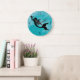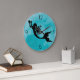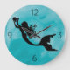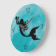 Sleek, contemporary clock with an enchanting mermaid silhouette against a turquoise-blue watercolor background. Black numbers and hands.
