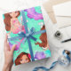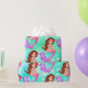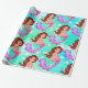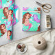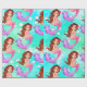 A bright Mermaid with dark hair on an aqua blue background is the basis of this wrapping paper design.