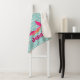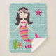 This adorable mermaid throw features a brunette mermaid with multi-coloured shell striped pattern tail in orange, fuchsia, light pink, and aqua. She is wearing a dark pink bikini top and has a pink floral headband on. She is swimming in a sea of aqua blue and white waves, with pink and orange starfish and seaweed accents. The sherpa throw is also personalised with a name that can be removed or changed to say whatever you want.