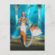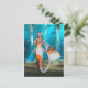 3D digital render of a cute mermaid with blue and green hair and yellow waterlily on blue fantasy ocean background