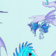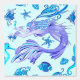 Beautiful, Weird, Purple and Turquoise Fairy Ocean Creature, this Mermaid is Swimmingm and looks like playing, surrounded by Starfishes, sea shells, seaweed, Fishes, and holding a little Seahorse on her hand; all the elements are assembled to compose a Fantasy Pattern. Vector Illustration Copyright BluedarkArt.