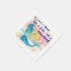 Whimsical, sea themed cocktail napkins feature a watercolor mermaid lounging on the beach, enjoying the sunset and a tropical drink with an "Of course I drink like a fish, I'm a mermaid" caption in violet blue brushstroke lettering. Art by KL Stock
