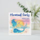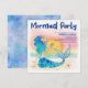 Whimsical, sea themed bridal shower invitation features a watercolor mermaid lounging on the beach, enjoying the sunset and a tropical drink with a "Mermaid Party" caption in violet blue brushstroke style lettering. Art by KL Stock
