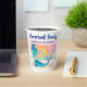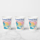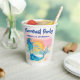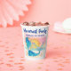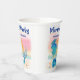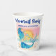 Whimsical, sea theme paper cups feature a watercolor mermaid lounging on the beach, enjoying the sunset and cupcakes with a "Mermaid Party" caption in navy blue brushstroke lettering. You can personalise the occasion and name (shown here as if for a birthday party but you could personalise it for any name or occasion). Art by KL Stock