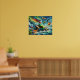 abstract oil painted look with a picture of a a mermaid topical fin in red and green top sitting on a rock with the ocean and five other colourful topical fish and whales and seals around her with a blue sky.green seaweed floating . This design features brilliant gold lightning colours and powerful pose .with paint drips on it