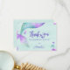 Mermaid birthday party thank you card with personalised message. Design features fantasy magical mermaid tails and ocean bubbles with "thank you" lettered in mermaid themed typography. It has a watercolor colour palette of pink purple turquoise and mint green. Mermaid party invitations and supplies are available in store but please message me if you need further templates.