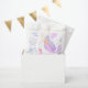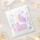 Bring an enchanting touch to your mermaid 1st birthday or under the sea 1st birthday celebration with these adorable watercolor favour bags 🎁🌊. The dreamy pastel design features a smiling violet mermaid 🧜♀️ wearing a birthday hat 🎉 and holding soft pink balloons 🎈, surrounded by sparkling purple stars ✨. Alongside her swim a pink jellyfish wearing a party hat 🪼, a cute seahorse 🎀, a cheerful crab 🦀, pastel blue starfish ⭐, floating seaweed 🌿, playful fish 🐟, and gentle bubbles 💦 — all set against a crisp white background.