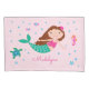 This pillow case features a cute whimsical mermaid with turtle, seahorse, bubbles, fish and starfish on a pink background. Personalise it with a name.