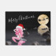 This Merry Christmas holiday doormat features a beautiful mermaid in pink wearing a Santa hat. She is sitting on a rock with a full moon and silhouette of Santa, his sleigh and reindeer in the background.