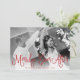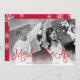 Chic holiday photo card for newlyweds features your favorite horizontal or landscape oriented wedding photo with "merrily ever after" overlaid in festive cranberry red script lettering. Personalize with your names and the year beneath. Cards reverse to a snowflake background with two additional square photos and an optional custom message to your loved ones.