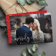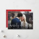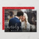 Share a favourite wedding photo this Christmas with our sweetly festive holiday card featuring "merrily ever after" in crisp white modern calligraphy script. Personalise with your names and the year. Card reverses to a red and white winter snowfall pattern.