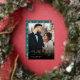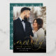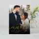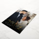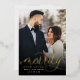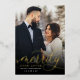 Elegant holiday photo cards for newlyweds feature a favourite vertical or portrait orientated wedding photo with "Merrily Ever After" overlaid in luxe gold foil calligraphy script. Personalise with your names or custom greeting beneath. A subtle and modern snowflake pattern on the reverse side completes the look. Perfect for sharing a wedding photo for your first married Christmas.